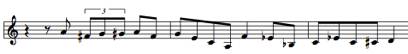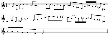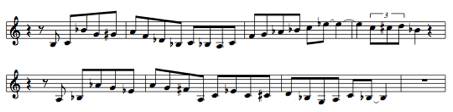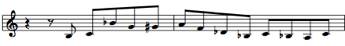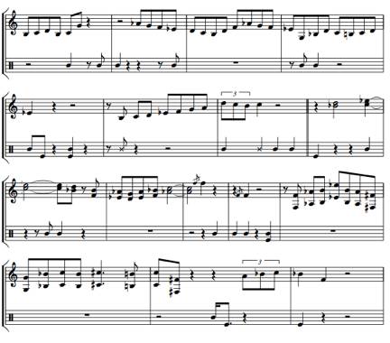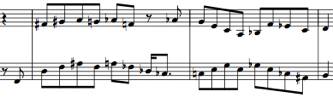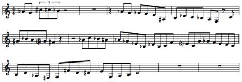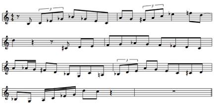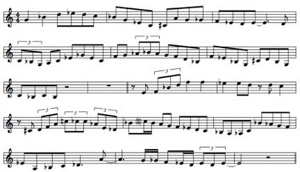 Both forms of this tetrachord are plentiful in Bird's spontaneous melodies and are among his favorite melodic structures. Even if you did not know the underlying harmonic structure of the song, you could discern the melodic structure by listening to how Bird emphasizes the second pitch from the top of the tetrachord, demonstrating which are the main tones and which are the passing tones. This again shows the importance of rhythm and stress in this music. Also in the consequent, Bird contracts the end of the phrase, again highlighting the structure of the tetrachord. Aurally this subtle change would probably be unnoticed by most listeners, which is the point, as in this case the consequent is really a subtle paraphrase of the antecedent. There is functional symmetry involved here, as technically the beginning of the two phrases contain the same pitches, but the B and Bb change function relative to the two tetrachords. In the first figure (1st measure), B natural is functionally part of the tetrachord and Bb is the passing tone, whereas in the second figure (middle of the 3rd measure) Bb is functionally part of the tetrachord and B natural is the passing tone.