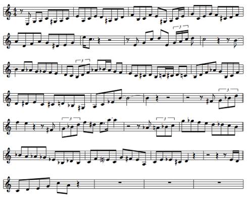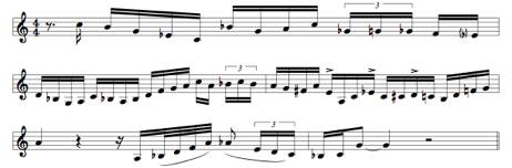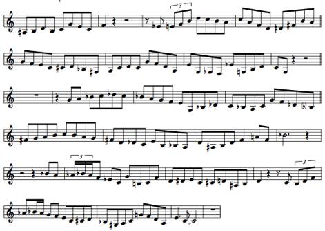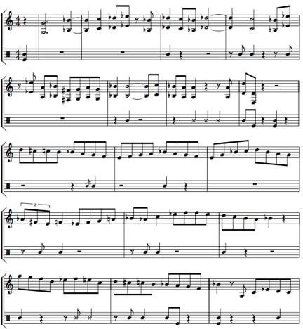 The phrase beginning at measure 9 in the example below (2:18 of the recording) and the phrase at measure 25 (2:32 of the recording) show how Parker's stresses hookup with the clave and cscara at key points in the phrasing of both.