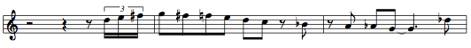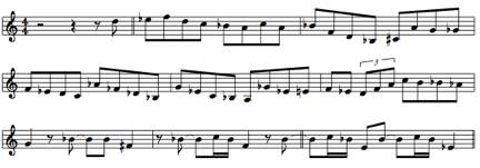 This version is also very dynamic. I love the space that Bird utilizes in this very loose version. Right from the beginning, when Parker plays the augmentation of the melody, we know that he is on top of his game. He does not even bother to complete the melody, immediately launching into a spontaneous statement. The bridge is beautiful! Obviously Parker meant to play the melody here, but stumbles a little. But he sounds like Michael Jordan here, if you follow what I mean, by adjusting in midstream and turning his misstep into a beautiful melodic statement where antecedent and consequent are both preceded by the same rhythmic misstep (mm 1 and 5 below), which transform the original stutter into part of the form of the statement. As with many of Bird's conversations, the form of the statement is irregular but makes perfect rhythmic sense in terms of balance, one of the traits that distinguishes him from most of his musical colleagues. Also the many alternate tonal paths and delayed resolutions (6th, 7th and 9th measures of bridge) add to the hipness of the statement.