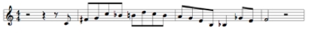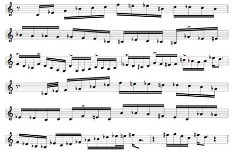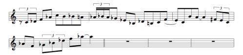 Of course, you need to listen to the recording to get a feel for the emphasis, but my point here is that there does not seem to be much discussion of this aspect of Bird's internal sense of rhythmic structure. Recognition of a sense of clave in Parker's playing is a key (pardon my pun) to beginning to investigate his complex rhythmic concepts in greater detail. It would be instructive to listen to Bird's spontaneous compositions only for their rhythmic content without regard for the pitches. Then it would be revealed that many of his phrases contain the same kinds of rhythmic structures found in the phrasing of the master drummers of West Africa, with the exception of the pitch conception. An investigation of the starting and ending points of Parker's phrases reveals a kinship to these Sub-Saharan drum masters.