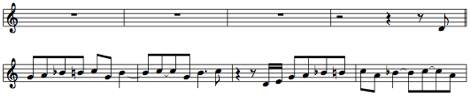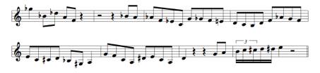 The antecedent is structured as a Lydian tetrachord, in this case G A B C, with a Bb passing tone added: