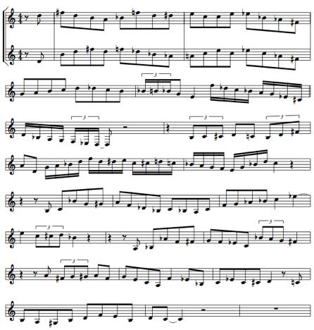 In discussing "Ko-Ko," first of all the rhythm of the head is like something from the hood, but on Mars! In the form and movement there is so much hesitation, backpedaling, and stratification. The ever-present phrasing in groups of three and the way the melody shifts in uneven groups, dividing the 32 beats into an unpredictable pattern of 3-3-2-2-3-3-2-2-1-3-4-4. By backpedaling I mean the way that the rhythmic patterns seem to reverse in movement; for example the 8s are broken up as 3-3-2, then as 2-3-3. By hesitation I am referring to the way the next 8 is broken up as 2-2-1-3, as kind of stuttering movement.