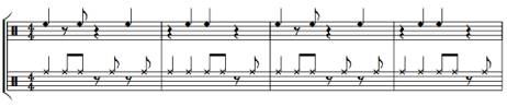 The shifting diminished harmonies of the saxophones are beautiful, not often heard in American popular music at that time, and it is uncanny how Bird's phrases fit perfectly melodically with the shifting textures from about 1:05 to 1:19 of the song. But what really turned me on to this song is the call-and-response montuno section at 2:11 and how Bird's spontaneous rhythms mesh perfectly with the Cuban players. Passages like this made me realize how often Parker's playing contained clave-like rhythmic patterns, a clear example of African retention. Even though the clave cannot be clearly heard, by listening to the cscara pattern in the previously referenced section at 0:46 of the song you can orientate yourself to the clave (clave on top below):