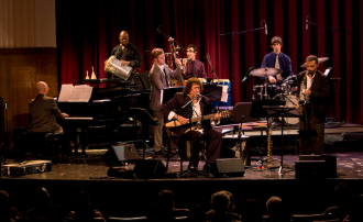 The concert was really three programs in one: first, conductor Justin DiCioccio led the the school's jazz orchestra through a set of elegant Jobim arrangements commissioned by members of the Westchester Jazz Orchestra. These included Scott Reeves' "Waters of March," Mark Patterson's "Agua de Beber" and Tony Kadleck's "Desafinado." Rather than count off the the band, DiCioccio rubbed his hands together to simulate the sound of feet shuffling through sand, setting up the deceptively simple pulse essential to bossa nova. To further emphasize the importance of this "foreign" rhythmic sensibility, on "Agua de Beber" the band set down their horns to follow him through a spokenese arrangement of vocal polyrhythms.