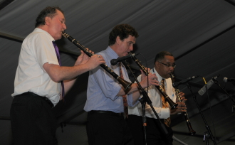 The rain was coming down hard outside -- so the covering of the tent was a much appreciated bonus for fans. It also provided a nice ambiance for the next set, a tribute to clarinetist George Lewis, featuring Dr. Michael White, Tommy Sancton and Sammy Rimington. The three clarinetists paid fitting homage to one of New Orleans' legends. Lewis is the celebrated figure behind such songs as "Burgundy Street Blues." Dr. Michael White has played with the Preservation Hall Jazz Band and founded The Original Liberty Jazz Band with a specific mission of preserving the musical heritage of the city. Whites music has been inspired by Lewis, Sanction wrote a book about Lewis and New Orleans jazz, and Rimington is one of Europe's top players of New Orleans-style jazz. The crew played to a packed crowd as the rain poured outside.