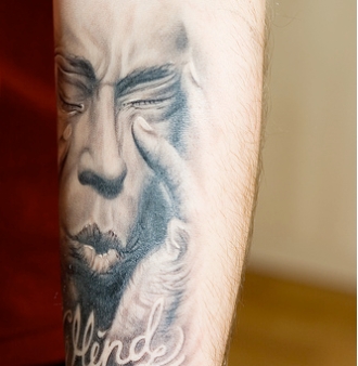 I have just finished my jazz themed whole sleeve. Trane, Bill Evans, Billie Holiday and Miles share the arm with silhouettes of a pianist and a saxophonist. Embedded in the smoke from Bill's cigarette is also the first four bars of donna lee in rhytmic notations (without any note lines (if that is a term)). If you want to post it on the site, just let me know. Cheers Love (It is in fact a real name in Sweden, it's the Swedish equivalent of the French Luis).